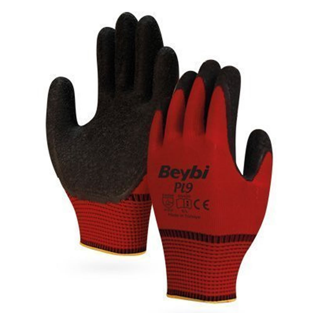 - • Siyah lateks kaplamalı kırmızı dikişsiz polyester örme crincle eldiven